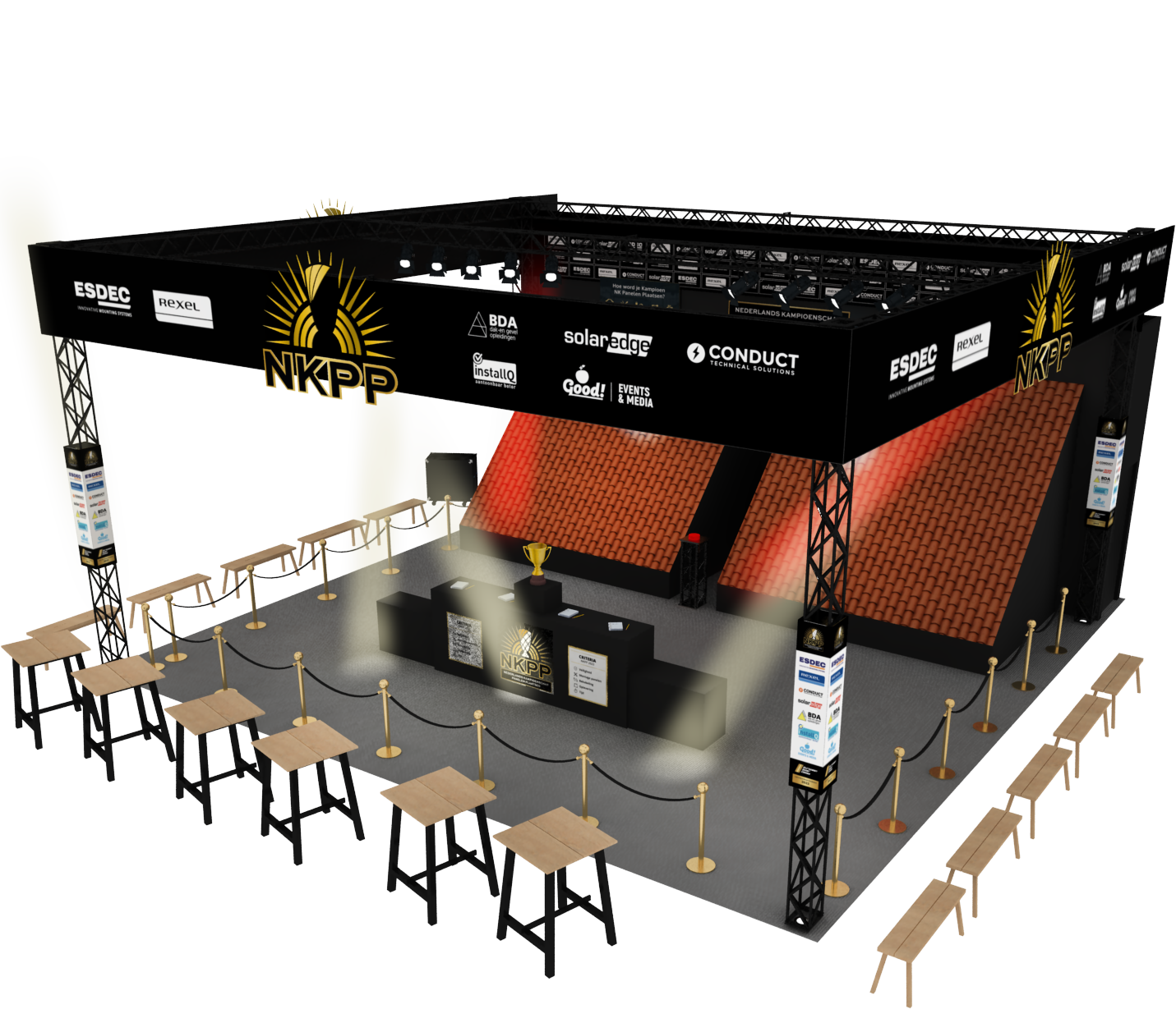 Een team van technici en spierballen is op locatie aanwezig om de beursstand op te bouwen, zodat jouw team bij binnenkomst direct aan de slag kan.